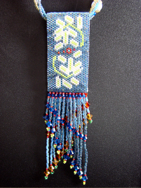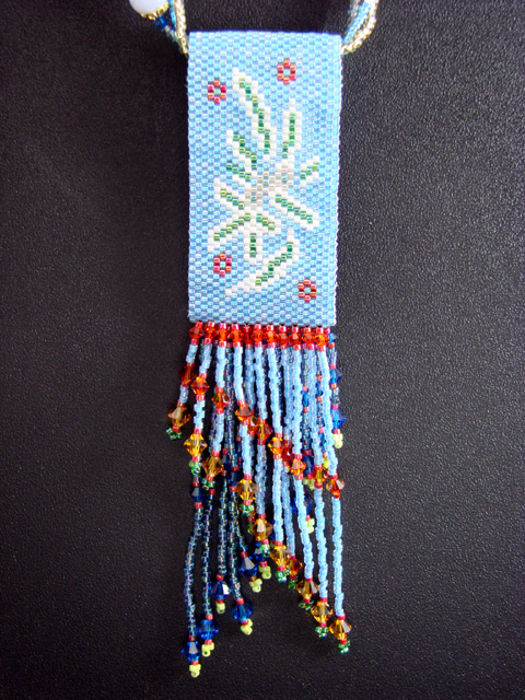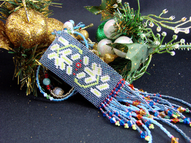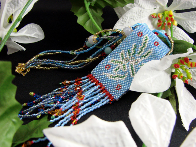 『夜の方はバックに濃い黒みがかったブルーを使い、初雪草(好奇心、楽俊)に絡め取られそうな、小さな赤い花(陽子さん)を。 昼の画像は、初雪草(好奇心、楽俊)の周りを、赤い花(陽子さん)がフワフワと……。フリンジ部分も夜昼交差するようなデザインにしてあります。チェーン部分は、ブルーレース(楽俊)とアマゾナイト(陽子さん)を絡めて……』(スライム9%様コメントより引用)